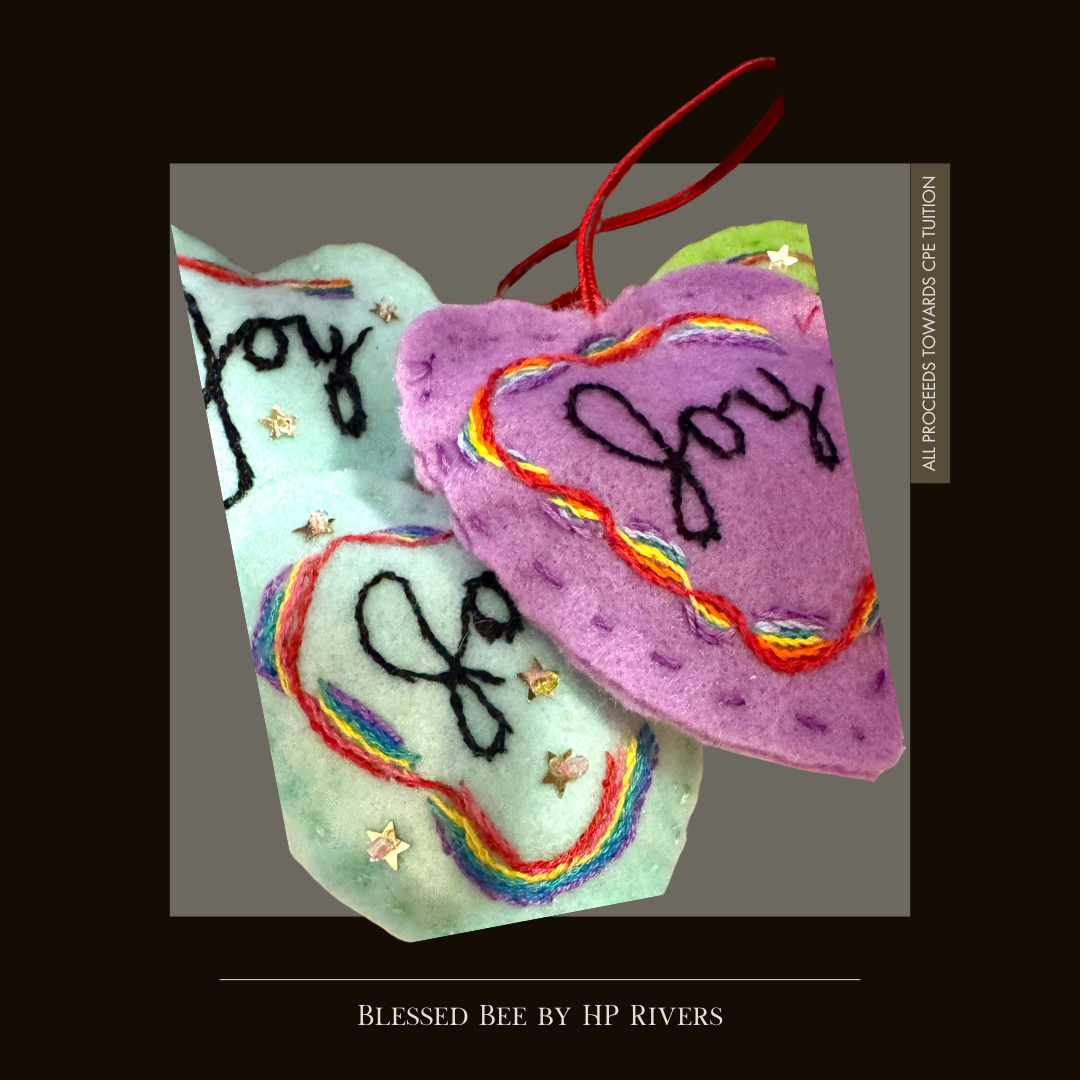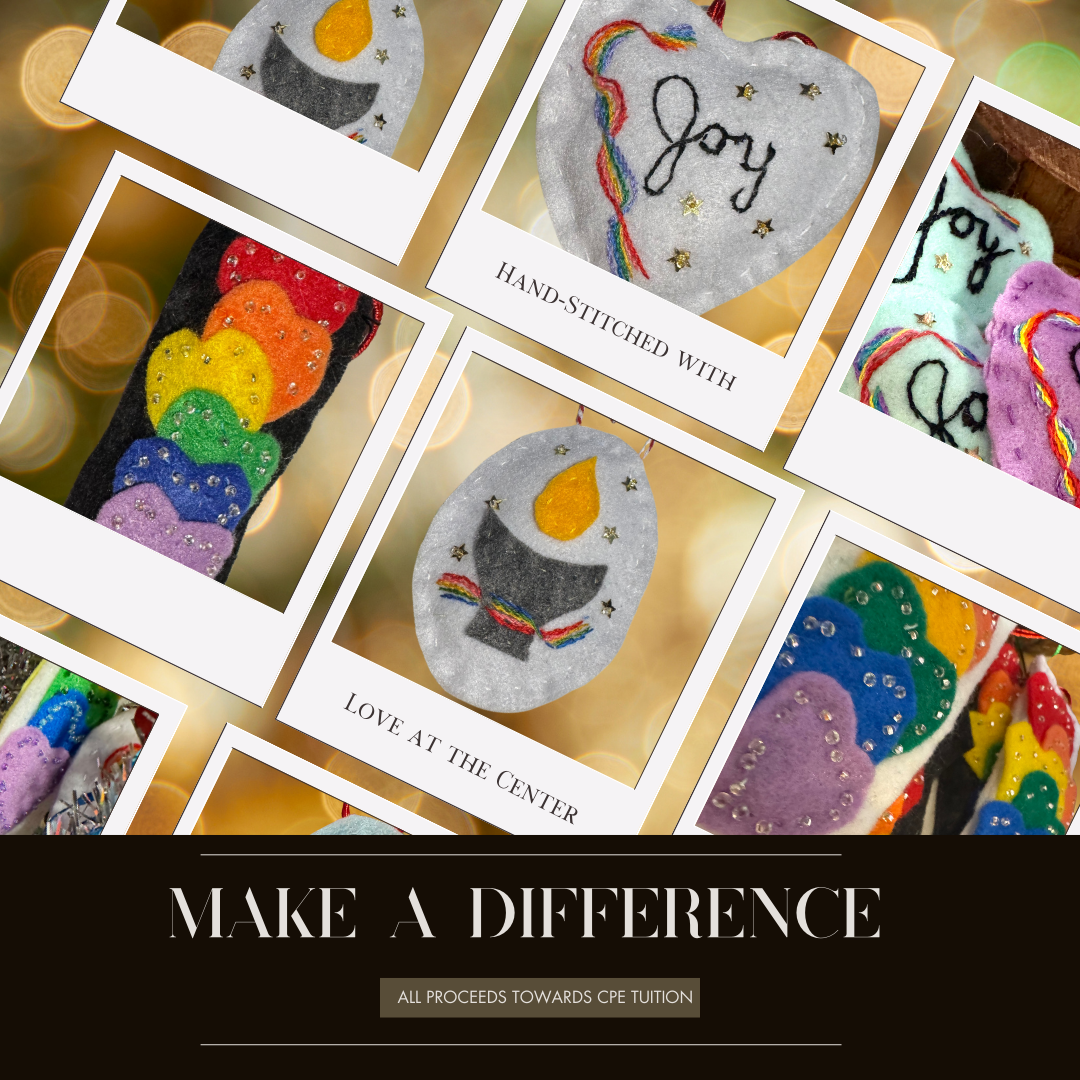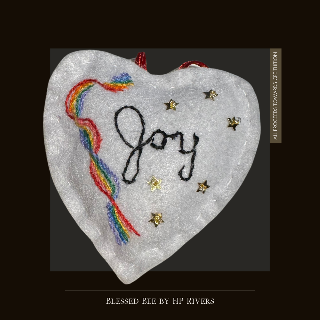 Each ornament has been handmade with love by HP's Nonnie, a bona-fide Polish-American artisan with incredible embroidery skills. Packages ship with a never-before-published prayer or poem written and signed by HP. Proceeds from these sales will go towards CPE tuition for HP and another queer UU seminarian. Together, they need to pay about $3000 in order to receive credit for their CPE unit.